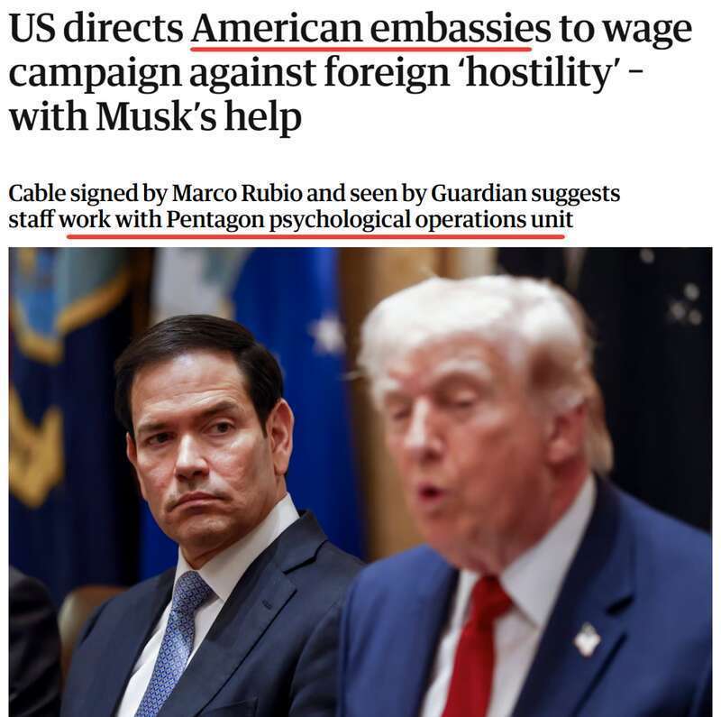 《卫报》获取的电报显示,美国政府指示各使馆和领事馆聚焦5个关键目标:反制敌对叙事、扩大信息获取、揭露对手行为、放大亲美声音,以及“讲述美国故事”。